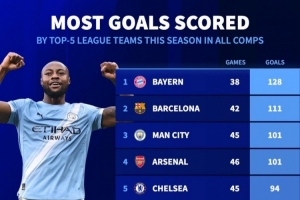 本赛季五大联赛球队进球榜:拜仁128球居首,巴萨111球次席