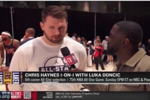 这高兴的!东契奇采访被文班突然伸手吓到了:我们现在可是队友呢