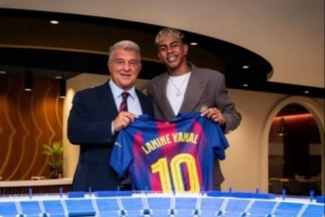 在巴萨大选即将到来之际,亚马尔更新社媒晒出和拉波尔塔的合照,并配上红蓝心表情。